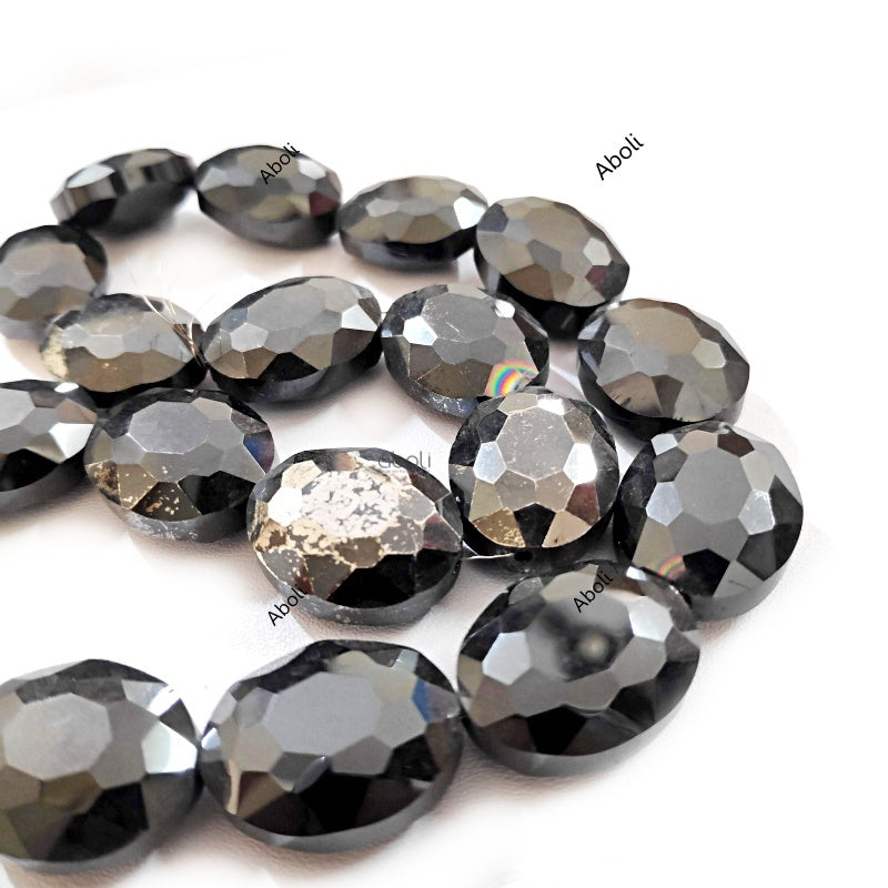 Black flat oval Faceted crystal glass bead 20 x 15 x 9 mm with silver foil finish FGB99