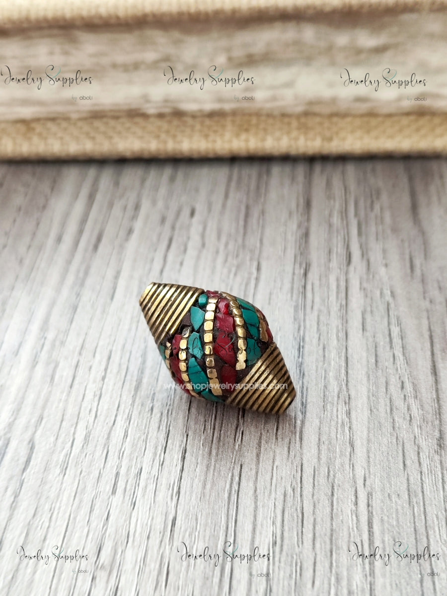 - Nepal bead Tibetan brass coral turquoise inlay beads handmade NB04 handmade by artisans