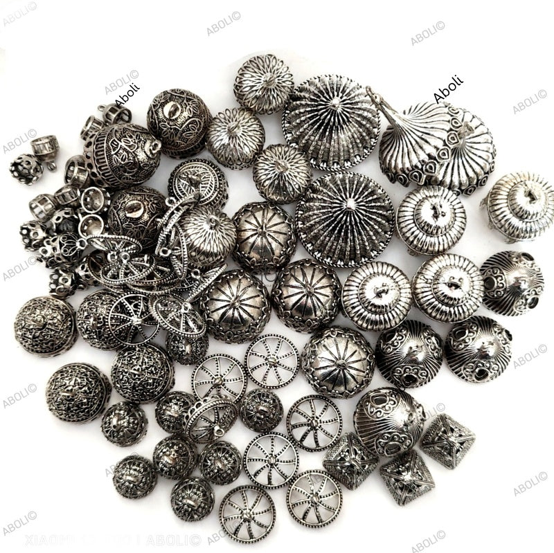 Listing is for 1 kg of silver jhumka bases in assorted sizes and designs.